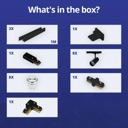 | Herstellername | Complete L shaped 1-Phase Track Set Black incl. 8x Spot fixture + GU10 2700K 3W Dim – 1 x 2 meter i | |