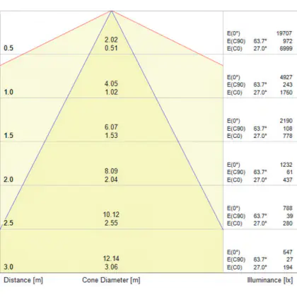 Der Abstrahlwinkel bezeichnet den Winkel, in dem das Licht aus der Lichtquelle ausgestrahlt wird. Er wird in Grad (D) angegeben. Je geringer die Gradzahl des Abstrahlwinkels ist, desto kleiner ist auch der Durchmesser des Lichtkegels, den die Lichtquelle produziert.