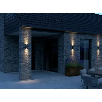 Die Nordlux Nico Aussenleuchte schafft im Handumdrehen eine elegante Beleuchtung. Dies liegt daran, dass das Licht sowohl nach oben als auch nach unten strahlt und einen schönen Lichteffekt an den Wänden erzeugt. Die Leuchte ist für 2 GU10-Glühbirnen mit bis zu 35 W geeignet. Wir empfehlen hierfür eine warme Lichtfarbe: 2700 bis 3000 K.