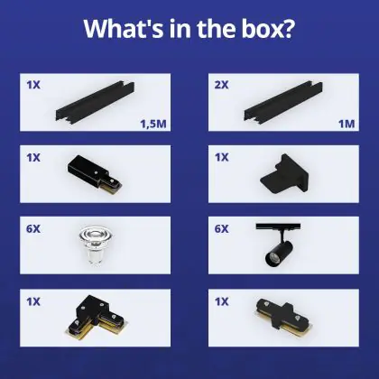 | Nom du fabricant | Complete L shaped 1-Phase Track Set Black incl. 6x Spot fixture + GU10 2700K 3W Dim – 1,5 x 2 meter | |
