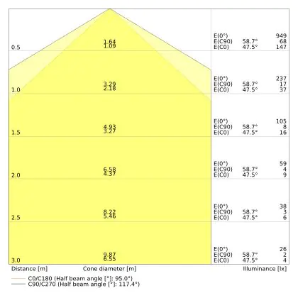 Le code couleur se compose de l'indice de rendu des couleurs (IRC) et de la température de couleur (Kelvin). Le premier chiffre indique le rendu des couleurs (1 = très mauvais rendu des couleurs, 9 = meilleure authenticité des couleurs). Le deuxième et troisième chiffre indiquent la température de la couleur. Exemple : Le code couleur "830" indique que la lampe a un bon rendu des couleurs (8) et une couleur de lumière blanche chaude (30 = 3000K). |