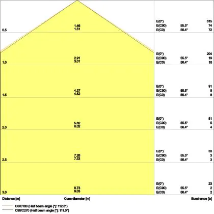 Le code couleur se compose de l'indice de rendu des couleurs (IRC) et de la température de couleur (Kelvin). Le premier chiffre indique le rendu des couleurs (1 = très mauvais rendu des couleurs, 9 = meilleure authenticité des couleurs). Le deuxième et troisième chiffre indiquent la température de la couleur. Exemple : Le code couleur "830" indique que la lampe a un bon rendu des couleurs (8) et une couleur de lumière blanche chaude (30 = 3000K). |