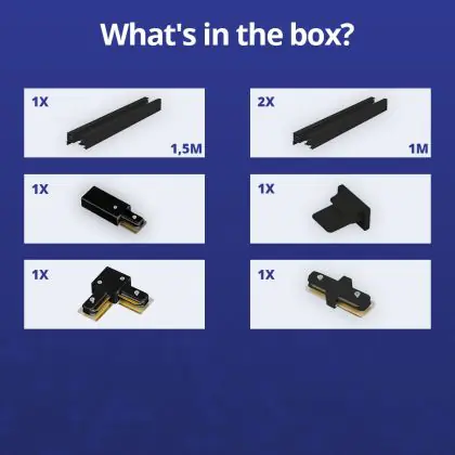 | Nom du fabricant | Complete L shaped 1-Phase Track Set Black – 1,5 x 2 meter incl. End Cap, Power Connector and L -Con | |